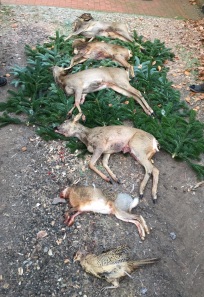 På dagens parade lå der: 1 sneppe, 4 rådyr, 1 hare og 1 fasanhøne.